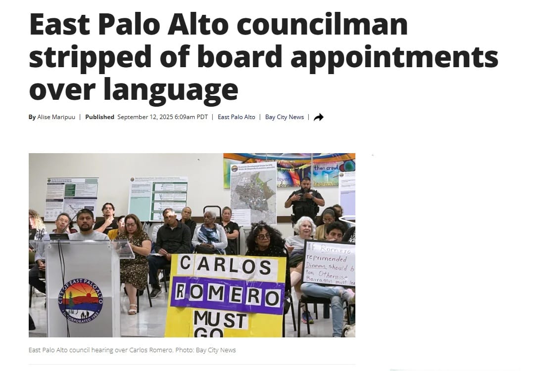 East Palo Alto City Council met on September 10th and voted to remove Carlos Romero from regional boards and commissions due to his repeated violations of our Code of Conduct.
