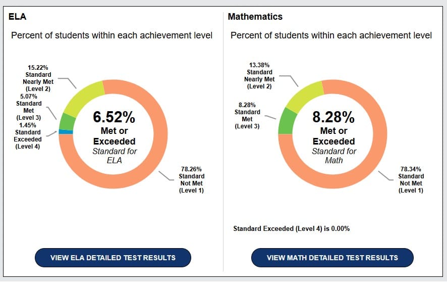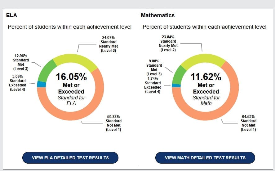 - English Language Arts (ELA): Proficiency climbed from 6.5% in 2023-2024 to 16.05% in 2025, representing a 146% jump. The pivot to phonics based instruction appears to be working?