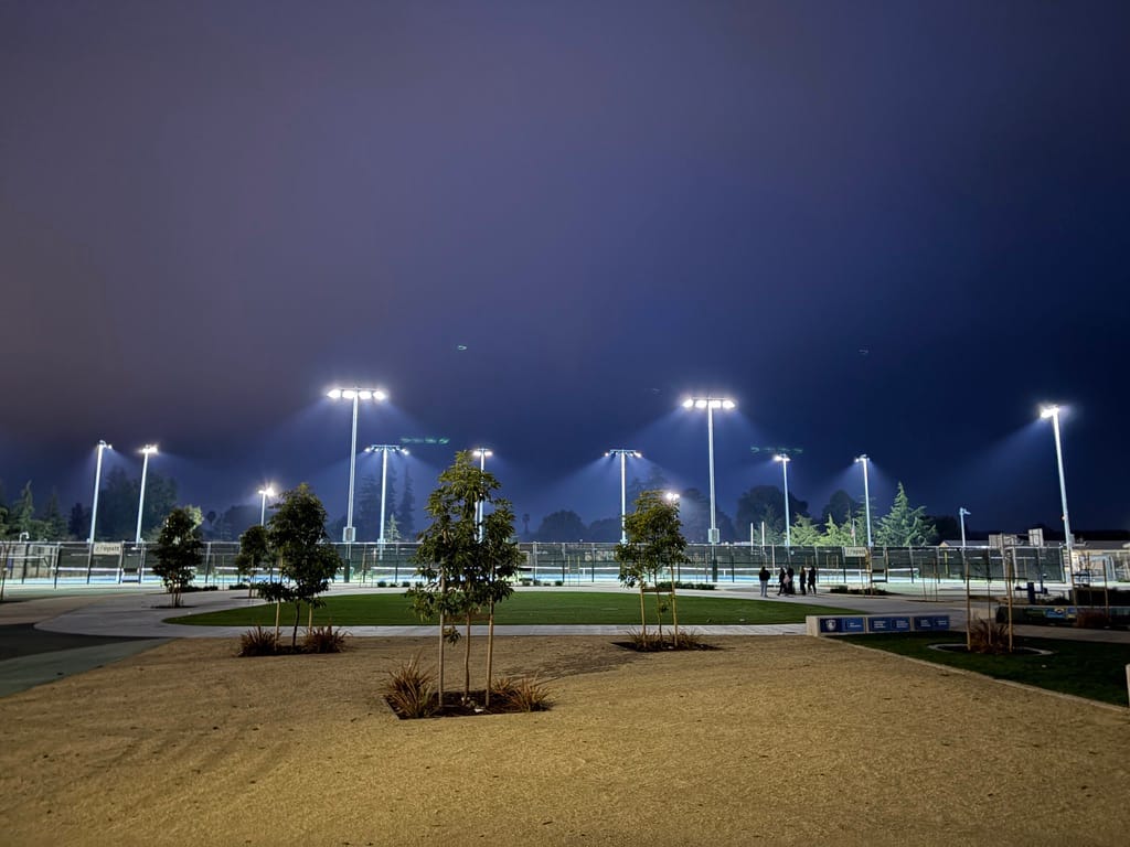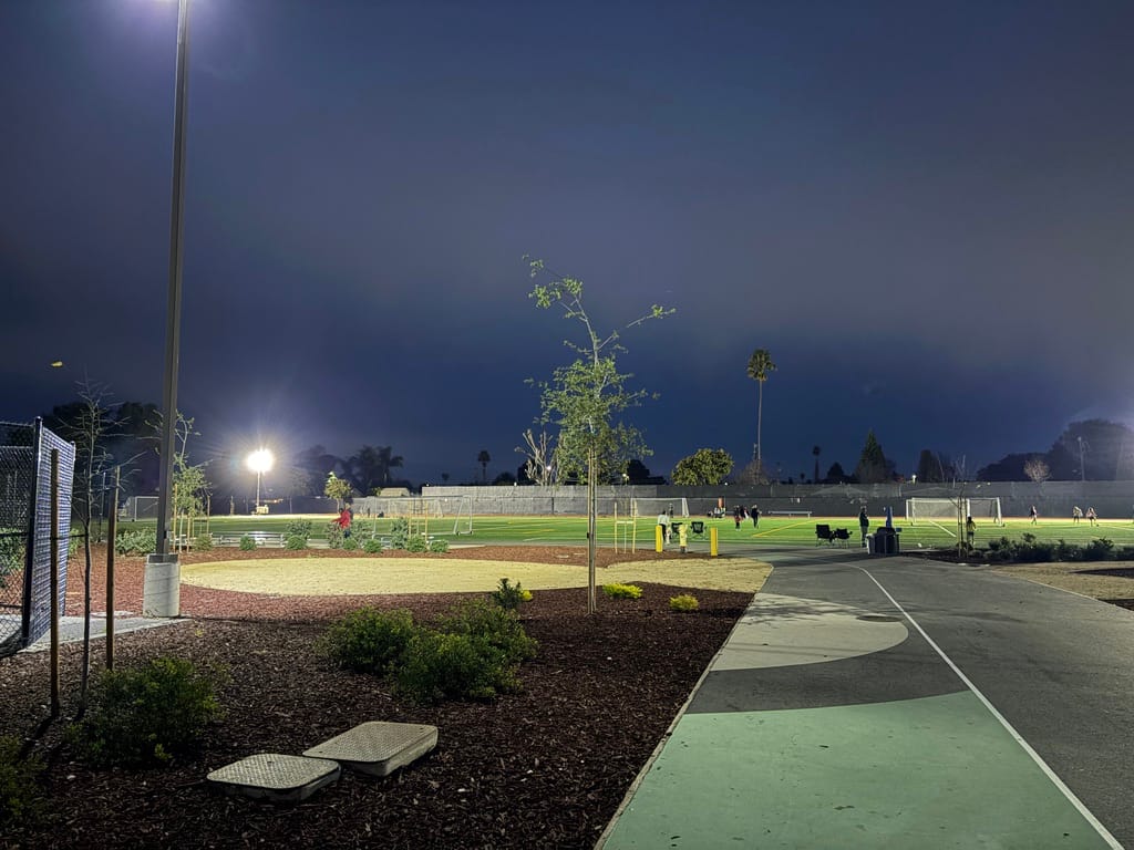 After finding a parking spot, I began the long walk across a dimly lit campus. To my right, the tennis courts shone brightly, and in the foreground, a mother and her children enjoyed dinner on the playground. Continuing on, I reached the soccer fields, where the hum of tower lights filled the air. Some lights weren’t working, but I saw someone in the distance making repairs. The scene was vibrant, even in the darkness.