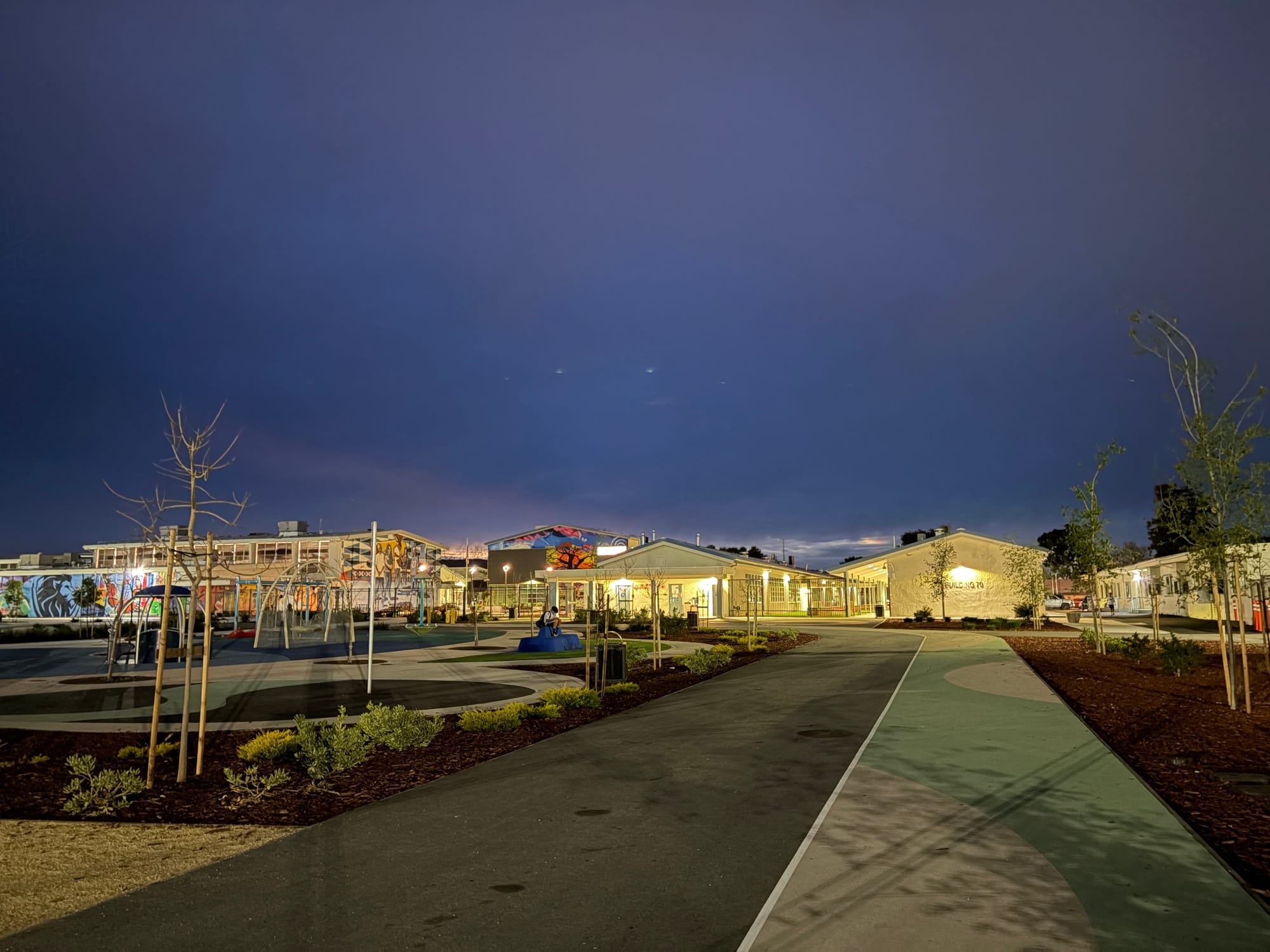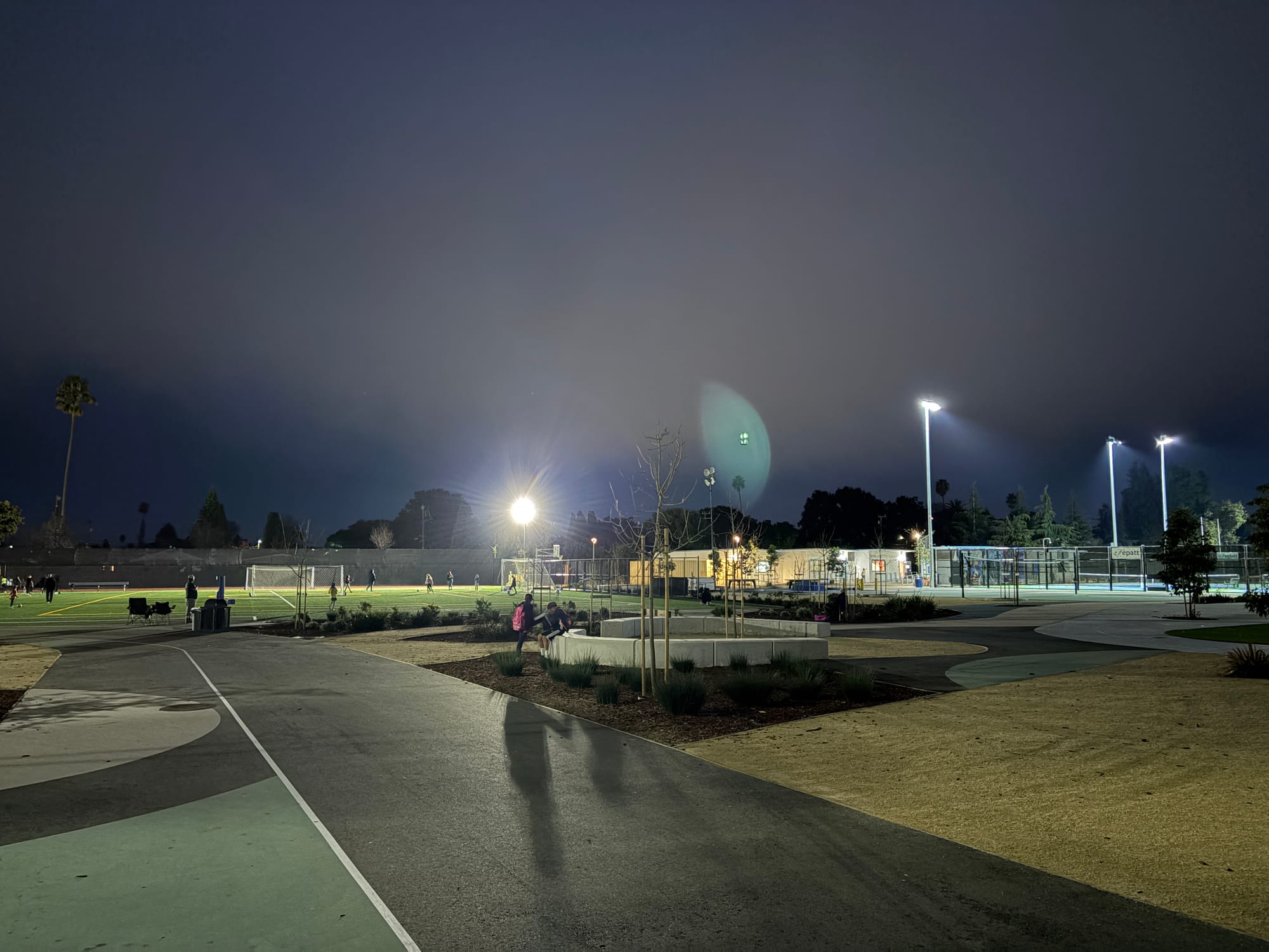 After finding a parking spot, I began the long walk across a dimly lit campus. To my right, the tennis courts shone brightly, and in the foreground, a mother and her children enjoyed dinner on the playground. Continuing on, I reached the soccer fields, where the hum of tower lights filled the air. Some lights weren’t working, but I saw someone in the distance making repairs. The scene was vibrant, even in the darkness.
