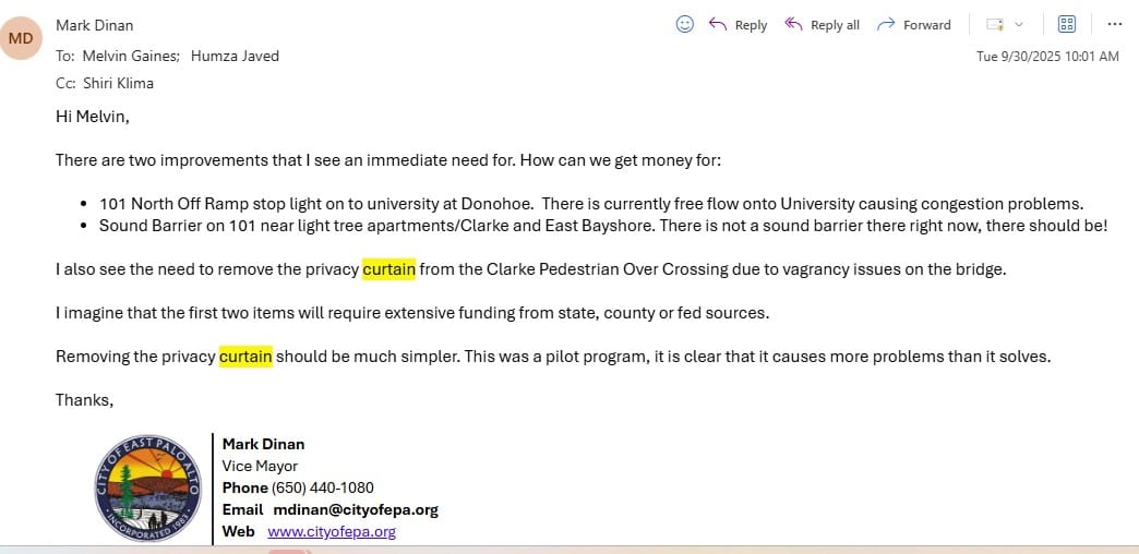 The push for change started with a conversation. Chris Kao, then-Chair of the Public Works and Transportation Commission, brought the issue to my attention during one of our regular walks along the Bay Trail. Last summer, he made a compelling case: the curtain had to go.