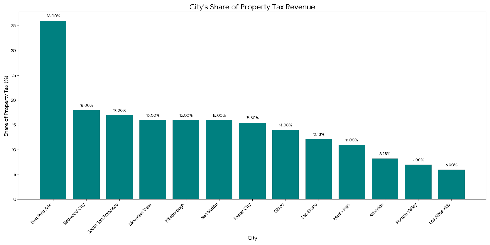 The bar chart above visualizes the property tax revenue share for each city, sorted from highest to lowest percentage.