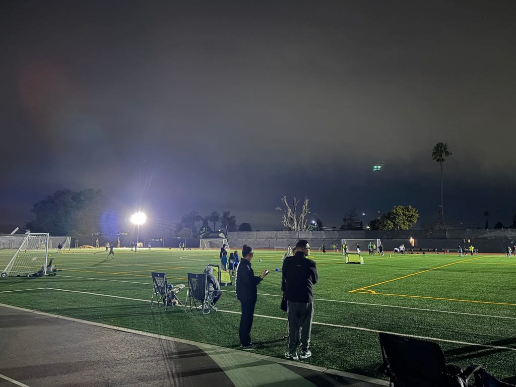 After finding a parking spot, I began the long walk across a dimly lit campus. To my right, the tennis courts shone brightly, and in the foreground, a mother and her children enjoyed dinner on the playground. Continuing on, I reached the soccer fields, where the hum of tower lights filled the air. Some lights weren’t working, but I saw someone in the distance making repairs. The scene was vibrant, even in the darkness.